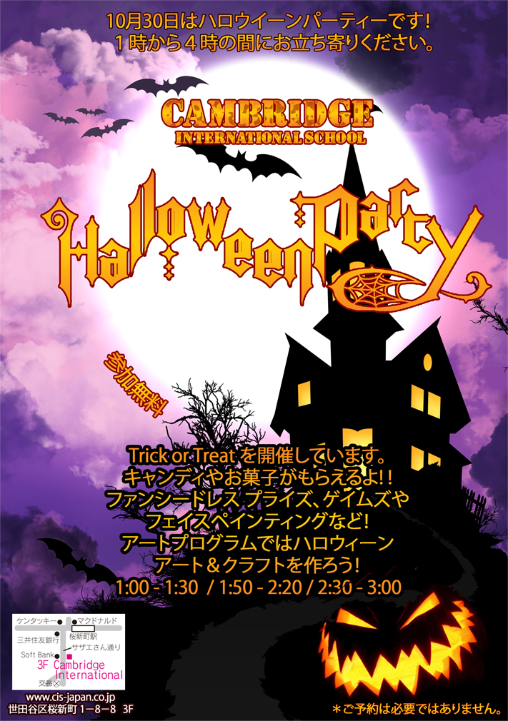 10月30 日はハロウィンパーティー!1時から4時の間にお立ち寄りください。